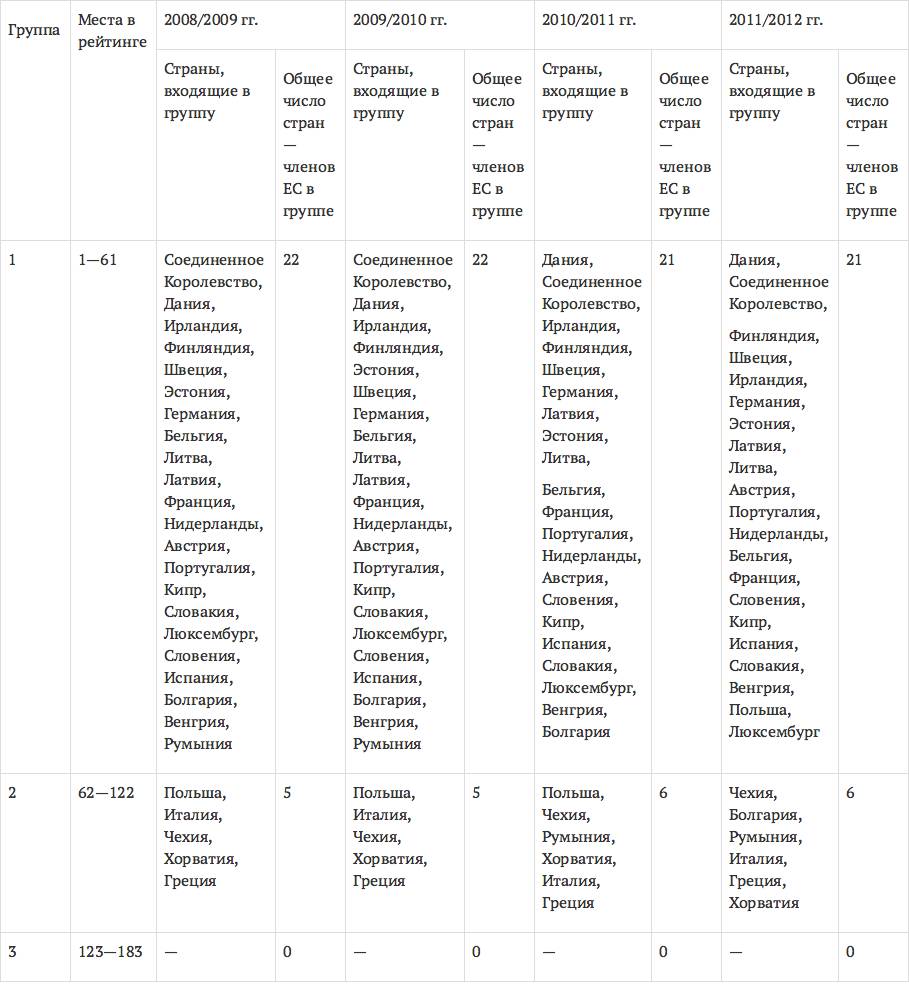Согласно исследованиям, лишь небольшое число стран, входящих в состав Европейского Союза, находятся во второй группе – 5–6, в зависимости от того, какой год рассматривается. Подавляющее большинство стран находится в группе № 1 (21–22). Отдельно хотелось бы отметить, что ни одна страна – член ЕС не находится в третьей группе, что подтверждает нашу мысль о том, что процессы реформирования и управления предпринимательской деятельностью со стороны государства идут весьма и весьма эффективно, особенно по сравнению с другими странами мира, в том числе и по сравнению с Россией.