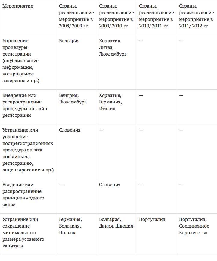 Рассмотрим более подробно реформирование в странах – членах ЕС, проводимое в отношении начала бизнеса или регистрации предприятий (см. табл. 1.4.2). Акт о восстановлении Европейского Союза от ноября 2008 г. очертил круг мероприятий по облегчению выхода на рынок новых компаний, особенно компаний, создающихся в сфере малого предпринимательства.