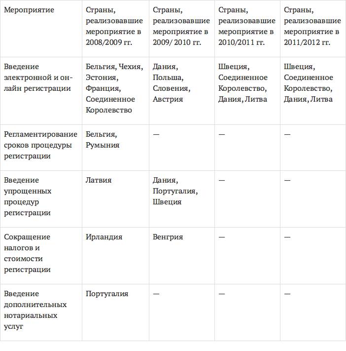 Так, в период 2008–2009 гг. 6 стран – участниц Европейского Союза упрощали систему регистрации собственности.