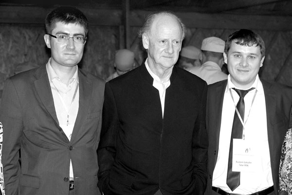 На Всемирном конгрессе писателей в Бишкеке (Кыргызстан, 2014) – Ленар Шаех, президент Международного ПЕНа Джон Сол, Рустем Галиуллин