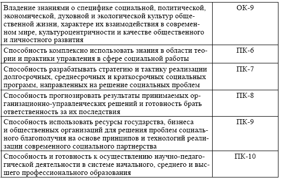 При изучении данной дисциплины необходимо достичь уровней обученности согласно Федеральному государственному образовательному стандарту по специальности «Социальная работа», а также в соответствии с квалификационными требованиями к подготовке выпускника. При этом необходимо исходить из того, что каждый профессионал в области социальной работы обязан владеть теорией, практикой и искусством управления, уметь четко определять цели своей деятельности, «стратегию и тактику», необходимые для их достижения. Процесс изучения дисциплины направлен на формирование следующих компетенций: