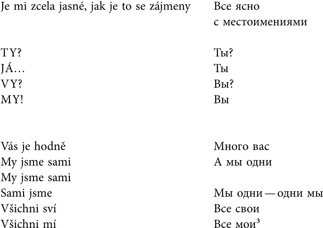 Под заголовком «Все ясно с местоимениями» это стихотворение вошло в некрасовский самиздатский сборник 1962 года и было включено в авторский свод «Геркулес», перепечатанный по заказу Вс. Некрасова в начале 1980-х годов Иваном Ахметьевым137. В более поздних редакциях заголовок отсутствует. Перевод, скорее всего, опирается на другую, не сохранившуюся редакцию, в которой после вопроса: «ТЫ?» Следует робкий ответ: «Я…» И после следующего вопроса: «ВЫ?» уже уверенное восклицание: «МЫ!»138. Учитывая вольное обращение Броусека со знаками препинания в других его переводах, можно предположить, что и здесь они являются лишь его интерпретацией, попыткой уточнить некрасовскую интонацию, передать ее на бумаге.