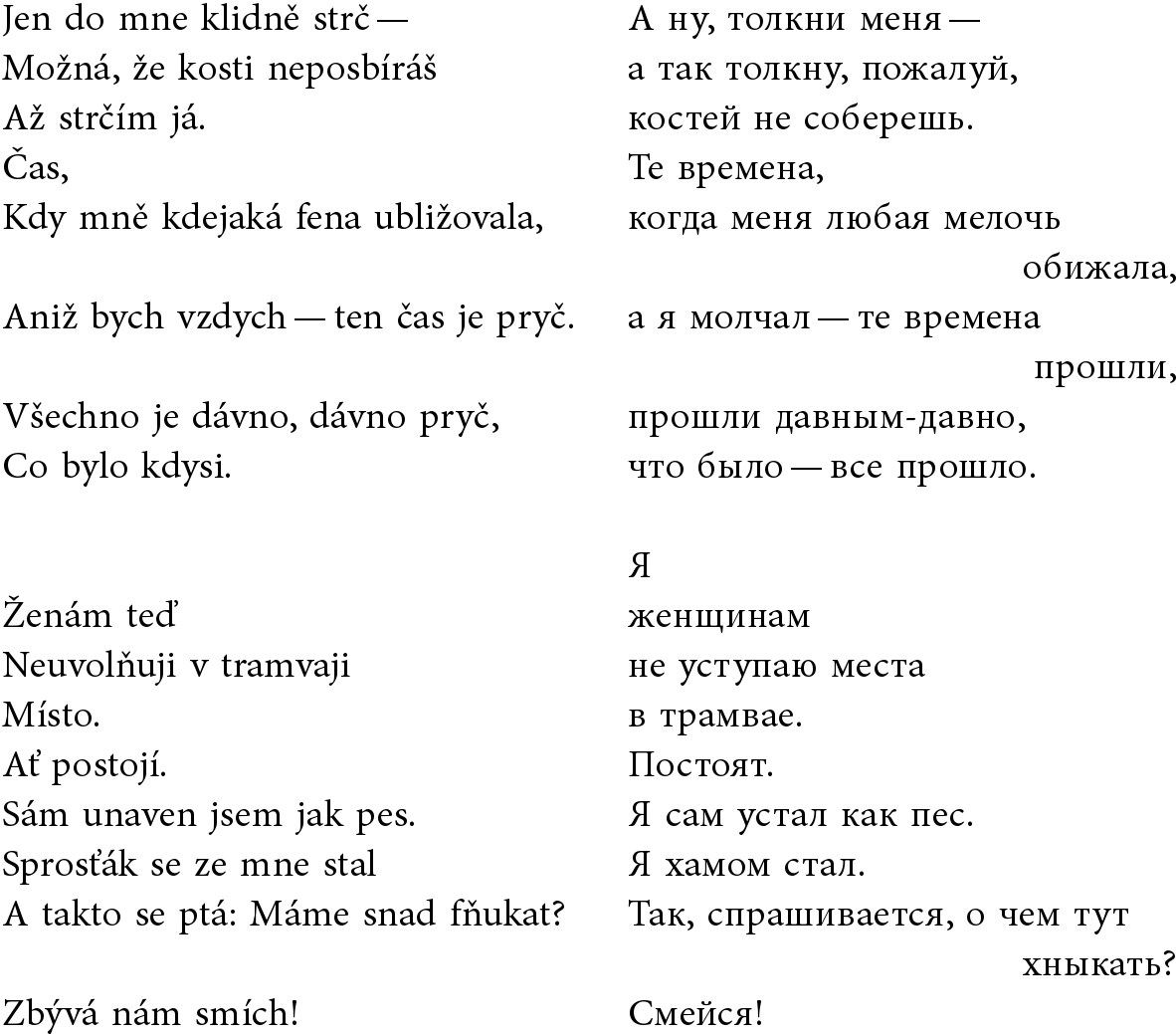 Напечатанные стихи не являются подборкой в обычном, переводческом смысле слова. Хотя я естественно старался соблюсти пропорцию между отдельными слоями поэзии Некрасова, подборку я в итоге должен был поневоле подчинить своим слабым переводческим способностям. Несмотря на все мои страдальческие усилия сжимать и освобождать чешский язык, мне пока не удалось найти для многих стихов, заслуживающих перевода, удовлетворительную, параллельную форму126.
