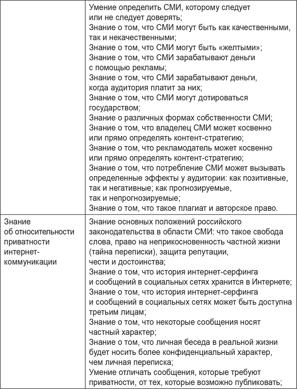 Составлено по: Цифровое будущее. Каталог навыков медиа- и информационной грамотности. – М.: МЦБС, 2013; Цифровая компетентность подростков и родителей. Результаты всероссийского исследования / Г. У. Солдатова, Т. А. Нестик, Е. И. Рассказова, Е. Ю. Зотова. М.: Фонд Развития Интернет, 2013; Оценка уровня медиаграмотности населения в разрезе субъектов Российской Федерации. – М.: ЦИРКОН, Мин-во связи и мас. коммуникаций РФ, 2016.