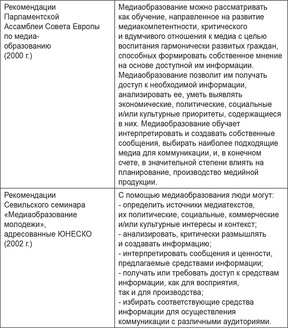 ЮНЕСКО, Совет Европы и другие международные организации неоднократно обращали внимание на просвещение и образование в сфере СМИ (см. табл. 3). Традиционные подходы к медиаобразованию менялись со временем[3]. Так, в 1970 гг. медиаобразование приобрело политический аспект, считалось, что на СМИ лежит ответственность за формирование политических взглядов. В 1980-1990 гг. главной стала защита детей (в Великобритании бытовало мнение, что средства массовой информации представляют «низкую» культуру, и могут разрушить ценности культуры «высокой», в США существовали опасения, что СМИ могут привить детям неприемлемые ценности и поведение). В начале XXI века акценты сместились в сторону развития творческих навыков и умений активной аудитории, особенно востребованных в условиях цифровой революции.