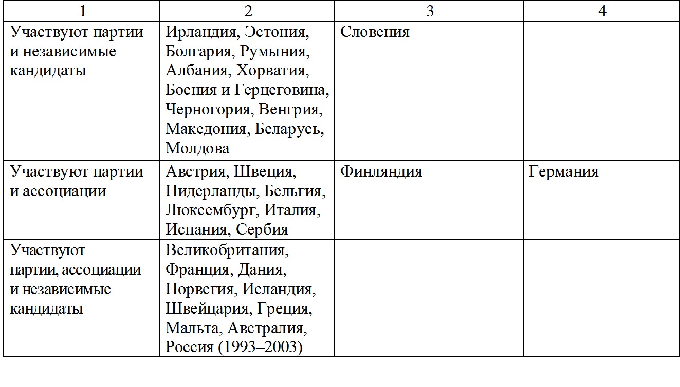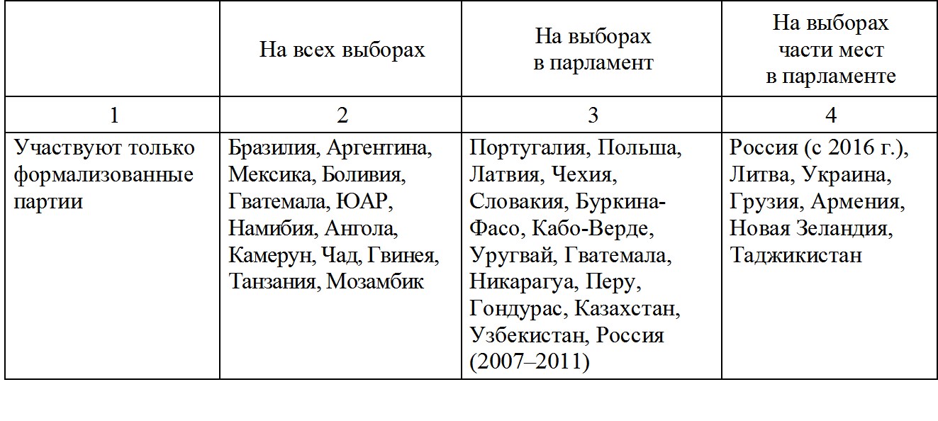 2. В 2007–2011 гг. в России практиковался жесткий латиноамериканский вариант: политические партии имели монопольные права при распределении всех мест в парламенте и при выдвижении кандидатов в губернаторы, а также преференции на других выборах [Голосов, 2008].