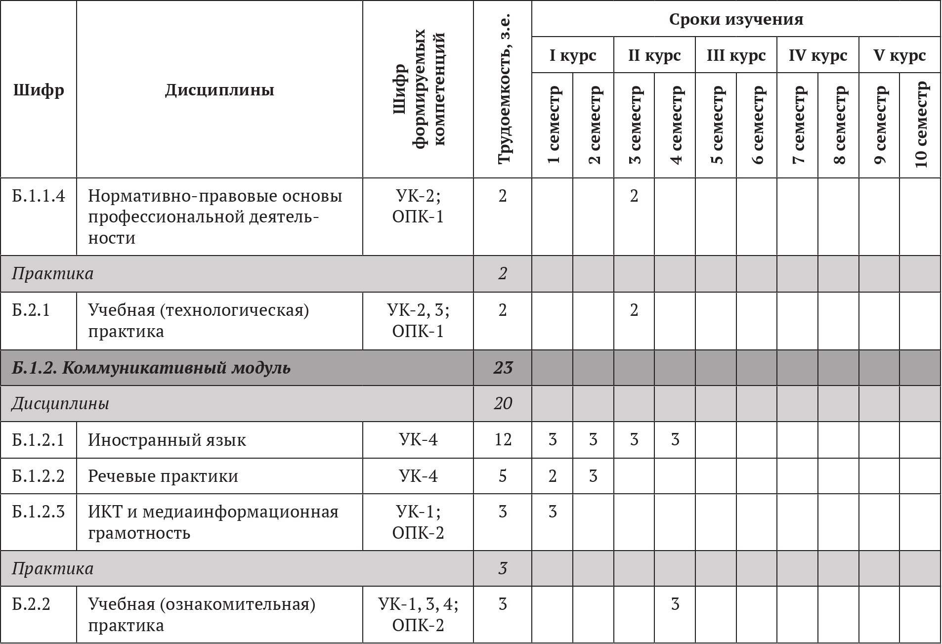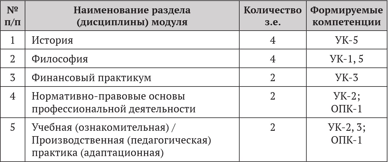 2. Место модуля в структуре образовательной программыСоциально-гуманитарный модуль относится к обязательной части блока 1 «Дисциплины (модули)» образовательной программы бакалавриата. Дисциплины социально-гуманитарного модуля изучаются в 1–6 семестрах. Для освоения дисциплин социально-гуманитарного модуля обучающиеся используют знания, умения, навыки, способы деятельности, сформированные в процессе изучения предметов «История», «Мировая художественная культура», «Обществознание», «Право», «Экономика» на предыдущем уровне образования. Дисциплины социально-гуманитарного модуля изучаются параллельно с дисциплинами коммуникативного, психолого-педагогического и предметно-методического модулей и являются основой для прохождения различных видов учебной и производственной практики и подготовки к государственной итоговой аттестации.