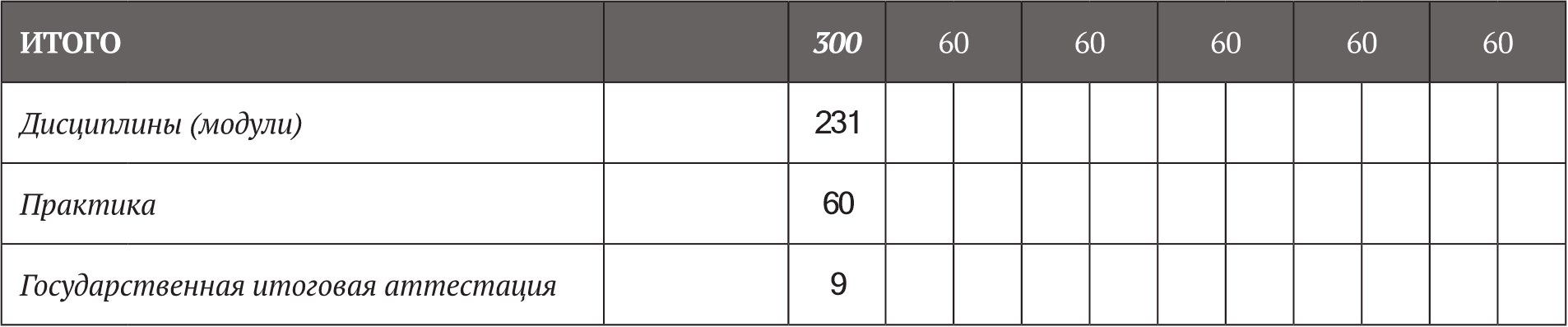 300 зачетных единиц (далее – з.е.) вне зависимости от формы обучения, применяемых образовательных технологий, реализации программы бакалавриата с использованием сетевой формы, реализации программы бакалавриата по индивидуальному учебному плану.