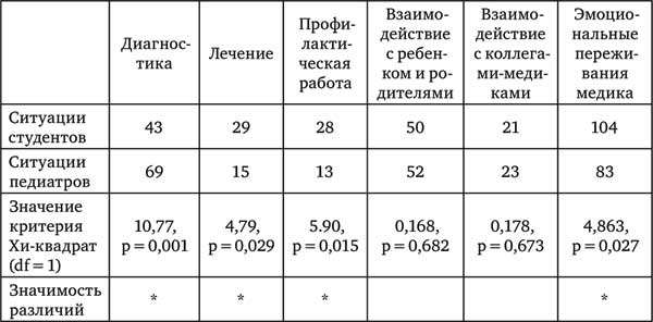 Таблица 1. Частота присутствия в описаниях ситуаций составляющих профессиональной задачи (статистически значимые по критерию Хи-квадрат различия отмечены *)