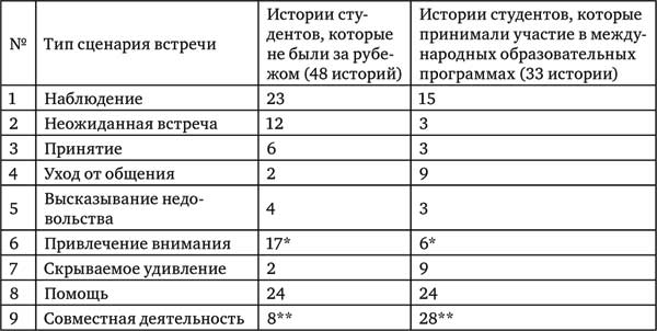 Выяснилось, что студенты, обладающие опытом «внешних» межкультурных отношений (выезжающие за рубеж, участвующие в международных образовательных программах), структурируют свой межкультурный опыт как отражение «совместной деятельности» представителей встречающихся культур (таблица 2).