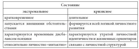 Кризисные состояния связаны с личностной структурой человека, так как они сформированы всей логикой личностного развития. Безусловно кризисное состояние, как и экстремальное, может быть вызвано и внешними событиями, но оно не порождено, а лишь спровоцировано ими.