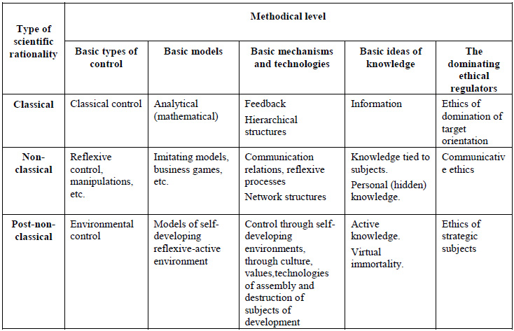 IntroductionIn recent decades Russian philosophy of science has recognized three stages in the development of science (classical, non-classical, and post-non-classical), which were proposed by V. S. Stepin (Stepin, 2005). If we ignore these changes, we risk losing sight of basic shifts in the scientific fields of control and in the evolution of cybernetics. Post-non-classical scientific rationality integrates all three types of scientific rationality.