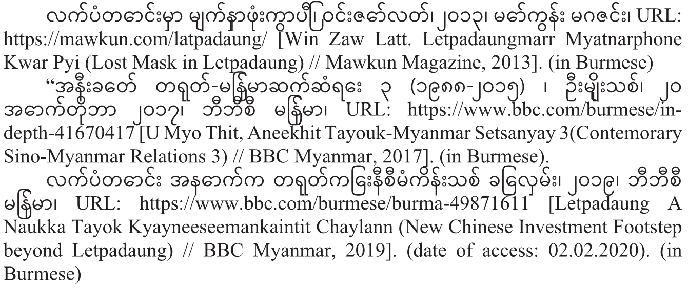 Atsuko Mizumo. Economica Relations Between Myanmar and China // JICA Research Institute, Department of International Economy and Business // Faculty of Economics // Kyushu University, Japan, 2016. URL: https://link.springer.com/chapter/10.1007/978-4-431-55735-7_8 (date of access: 19.02.2020). (in English)