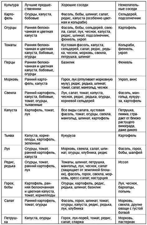 Приведенная ниже таблица подскажет, какую культуру за какой желательно (или наоборот – противопоказано) сеять. Какие растения уживаются в соседстве друг с другом, а каким соседство категорически противопоказано.