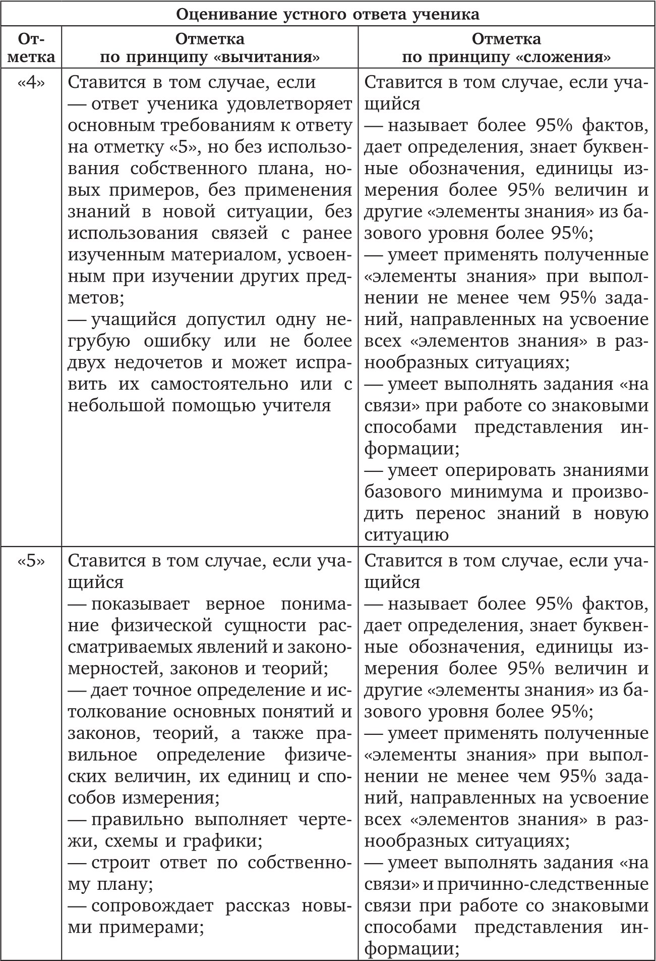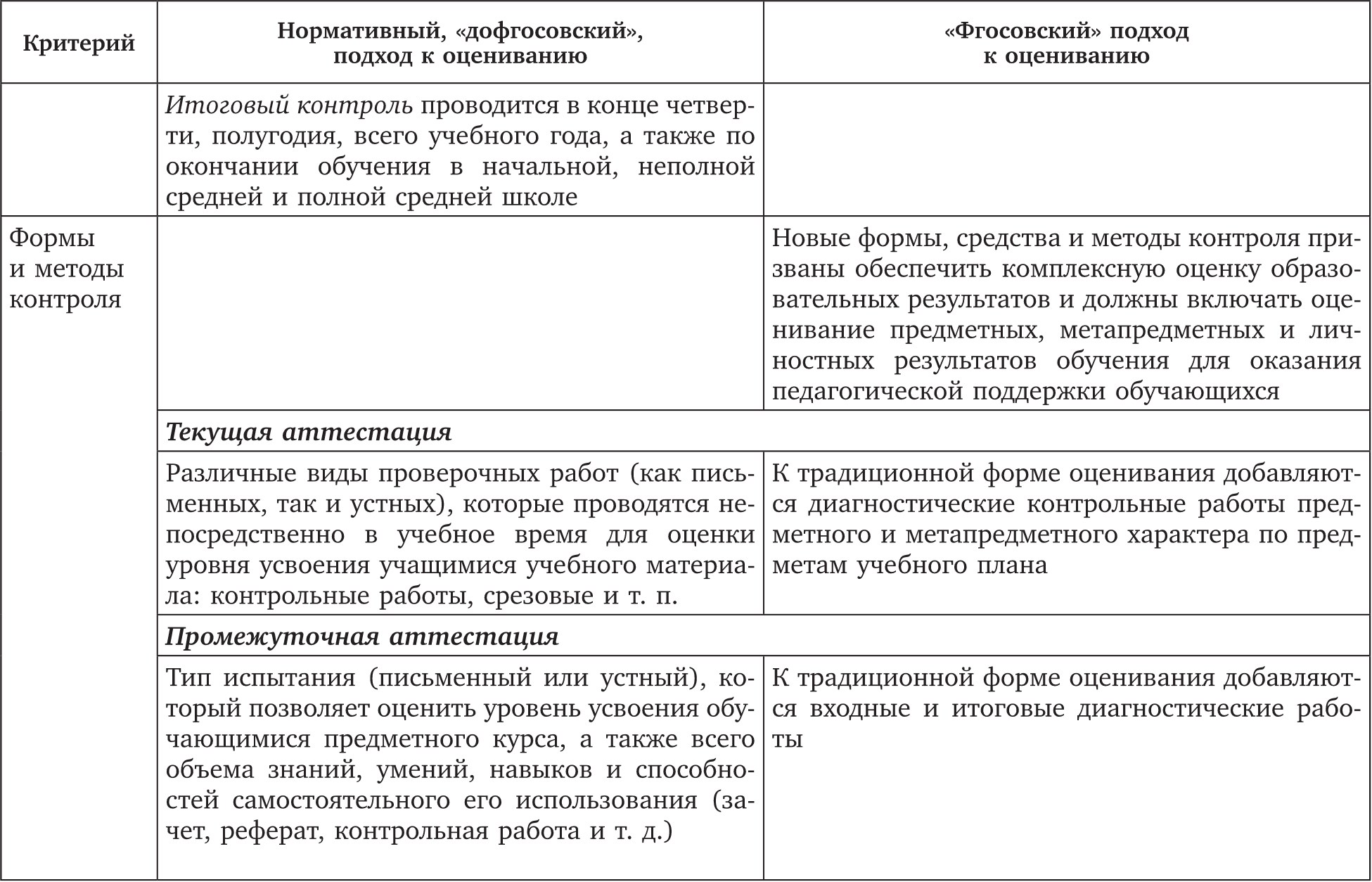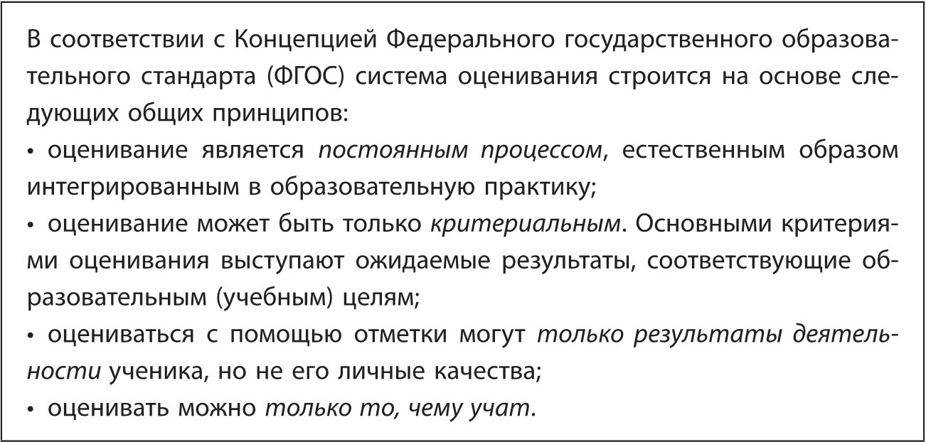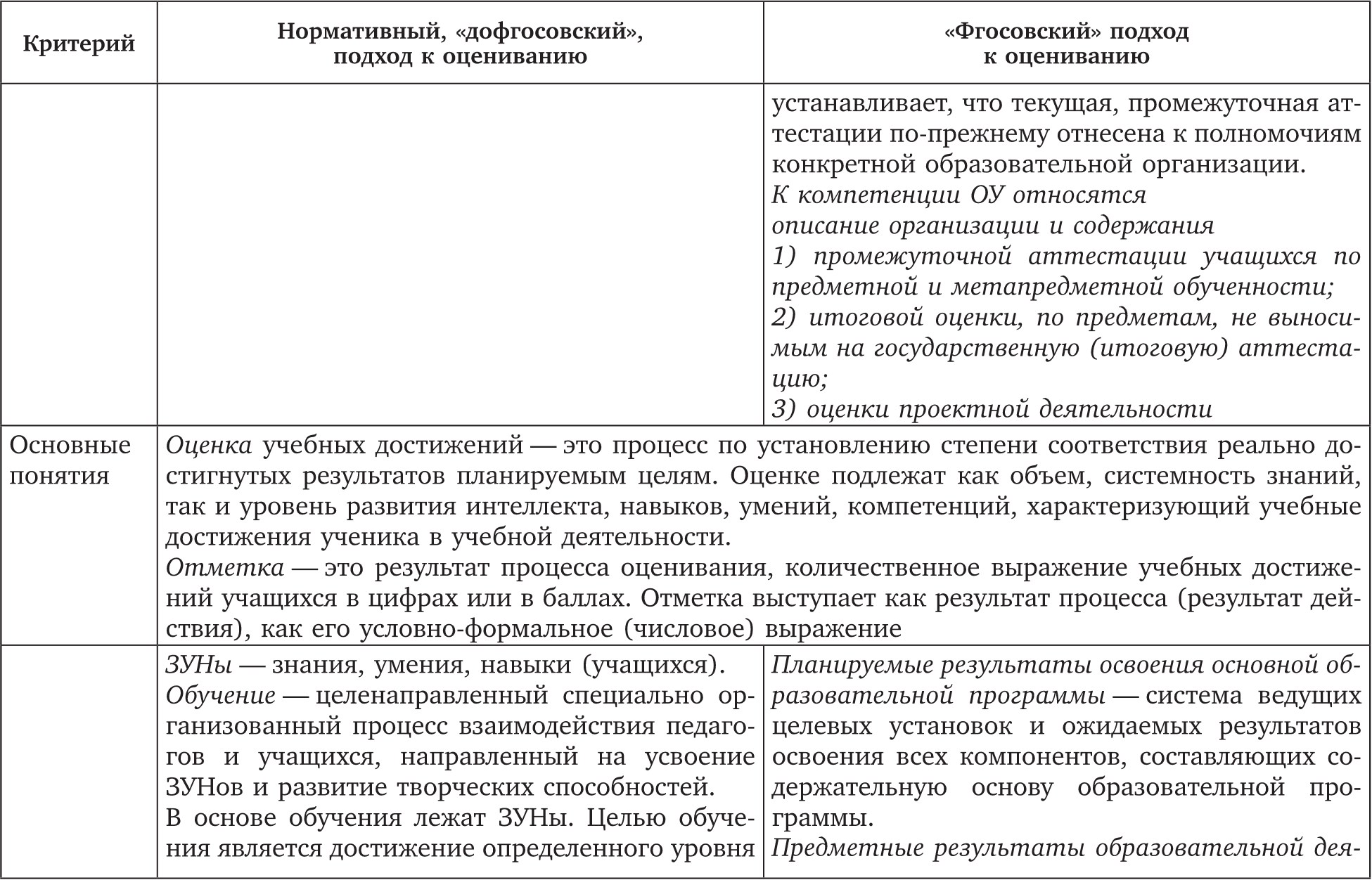 История оценочной деятельности в российской системе образования – отдельная тема для изучения, но именно в последние годы в подходах к оценке произошли существенные изменения. Эти изменения связаны с введением Федерального образовательного стандарта и закреплены в законе «Об образовании». Меняется характер контроля, сегодня становится актуальной комплексная оценка учебных и внеучебных достижений учащихся. В настоящее время используются различные формы оценки и оценочного инструментария, применяются стандартизированные и нестандартизированные методы (устные и письменные, индивидуальные; групповые и само- и взаимоценки). Меняется сам принцип оценки – от отметки «методом вычитания» к отметке «методом сложения» достижений учащегося (см. таблицу на с. 17–19).