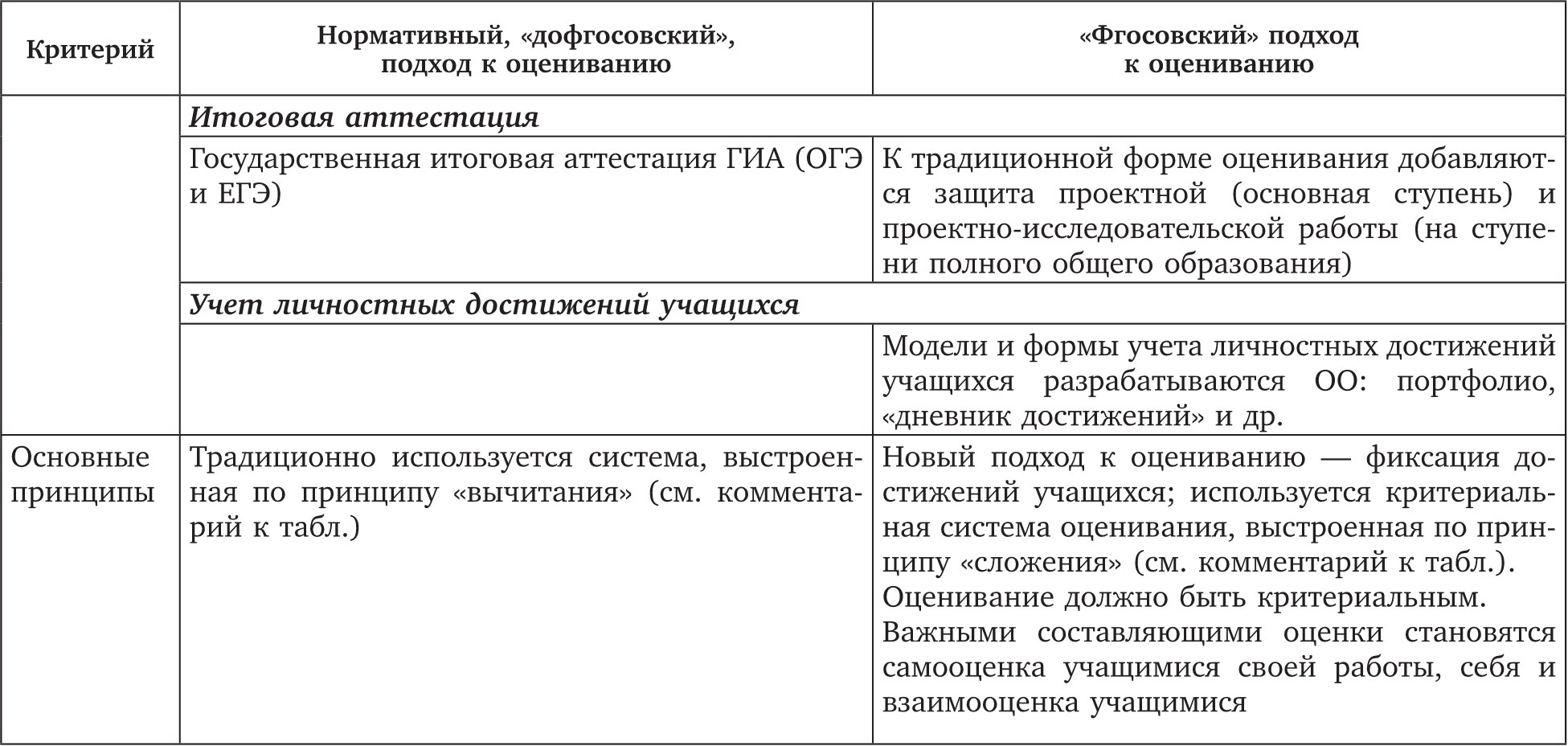 Введение стандарта в нашей стране – поэтапный процесс. В 2014/15 учебном году стандарт «переходит» в 4-й класс, в следующем учебном году – в основную школу. Таким образом, в настоящее время система оценивания носит черты «дофгосовской» нормативной системы и в то же время должна быть готова к новым подходам к оцениванию и к новым процедурам оценивания (табл. 1).