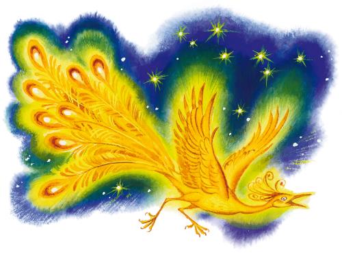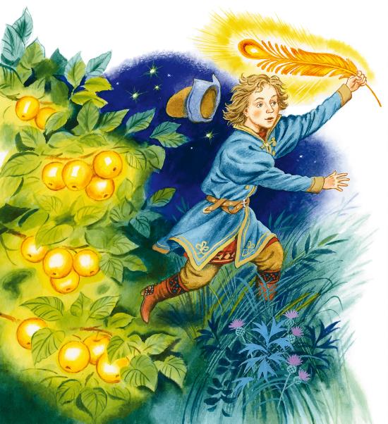 Половина ночи прошла, ему и чудится: в саду свет. Светлее и светлее. Весь сад осветило. Он видит – на яблоню села Жар-птица и клюёт золотые яблоки.