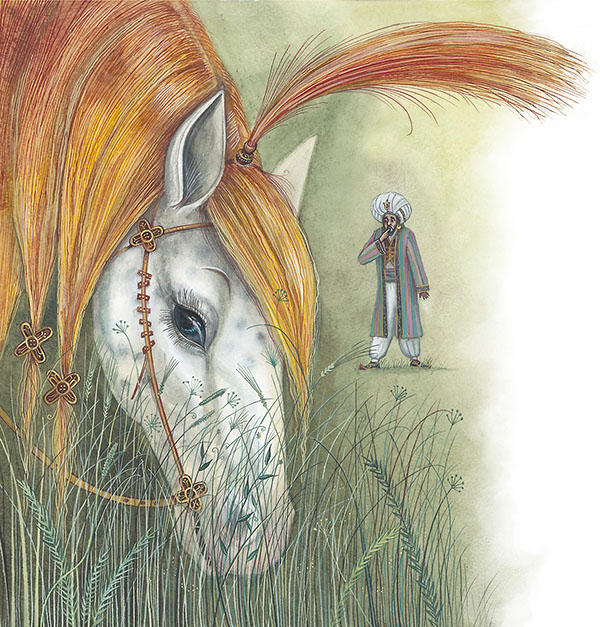 С жадностью утолив голод, я, в свою очередь, спросил их, что они делают в таком пустынном и диком месте. Они ответили, что их послал сюда царь Мирадж, владелец этого острова, что они его конюхи и каждый год приводят сюда лучших кобылиц из царских конюшен для того, чтобы отпускать их с морским конём, выходящим из воды. Так они выводят особую породу быстрых лошадей, которые называются у них морскими.