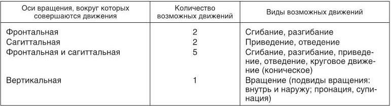 Количество и возможные виды движений вокруг существующих осей вращения представлены в табл. 1.2, 1.3. Так, вокруг фронтальной оси отмечаются два вида движений (сгибание и разгибание); вокруг сагиттальной оси также два вида движений (приведение и отведение); при переходе с одной оси на другую возникает еще одно движение (круговое, или коническое); вокруг вертикальной оси – одно движение (вращение), но у него могут быть подвиды: вращение внутрь или наружу (пронация или супинация).