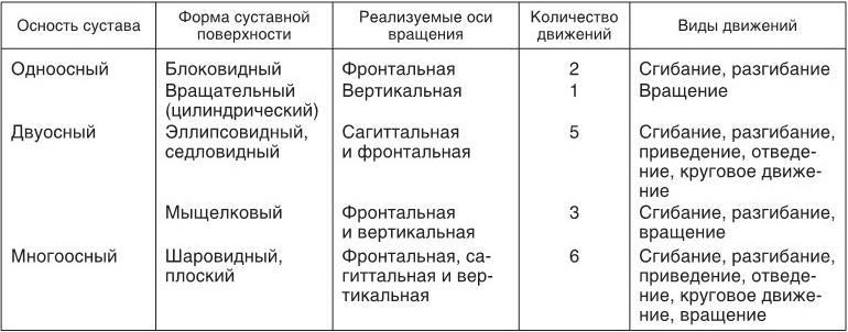 Движения в суставах вокруг осей вращения определяются геометрической формой суставной поверхности. Например, цилиндр и блок вращаются только вокруг одной оси; эллипс, овал, седло – вокруг двух осей; шар или плоская поверхность – вокруг трех.