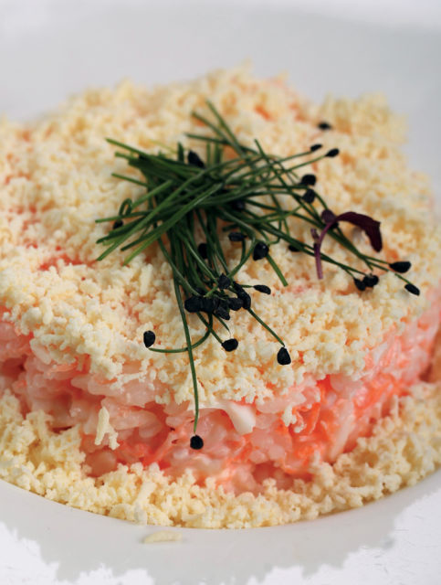 В форму выложить подготовленную осетрину, промазать майонезом с добавлением сока лимона, сверху выложить готовый рис, еще раз промазать смесью из майонеза и лимона. Затем выложить тертые на крупной терке яйца и шнитт-лук, смазать майонезом.