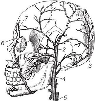 1 – ветви a. temporalis superficialis; 2 – a. temporalis superficialis; 3 – a. occipitalis; 4 – a. carotis externa; 5 – a. carotis communis; 6 – a. supratrochlearis; 7 – a. supraorbitalis