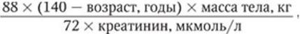 Скорость клубочковой фильтрации по MDRD-формуле (мл/мин/1,73 м2)= = 186 ´ (креатинин / 0,88 мкмоль/л)– 1,154 ´ (возраст, годы)– 0,203.
