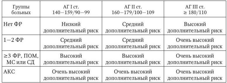 В зависимости от степени повышения АД, наличия факторов риска, признаков поражения органов-мишеней, сахарного диабета, метаболического синдрома и ассоциированных клинических состояний пациенты, страдающие АГ, могут быть отнесены к одной из 4 групп: низкого, среднего, высокого и очень высокого дополнительного риска (табл. 1.7). Низкому риску соответствует вероятность развития сердечно-сосудистых осложнений и смерти от них в ближайшие 10 лет < 15 %, среднему риску – 15 – 20 %, высокому – 20 – 30 % и очень высокому > 30 %. Оценка общего сердечно-сосудистого риска является обязательным компонентом диагностики АГ и имеет большое значение при выборе тактики лечения больного.