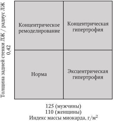 Для оценки состояния сердца применяются электрокардиография и эхокардиография, по результатам которых можно рассчитать вольтажные критерии гипертрофии левого желудочка (индекс Соколова – Лайона и корнельское произведение) и определить индекс массы миокарда левого желудочка. По соотношению толщины задней стенки левого желудочка и его радиуса с учетом индекса массы миокарда левого желудочка эхокардиография позволяет определить тип ремоделирования левого желудочка, что важно для оценки прогноза. Критерии диагностики концентрической, эксцентрической гипертрофии и концентрического ремоделирования левого желудочка представлены на рис. 1.2.