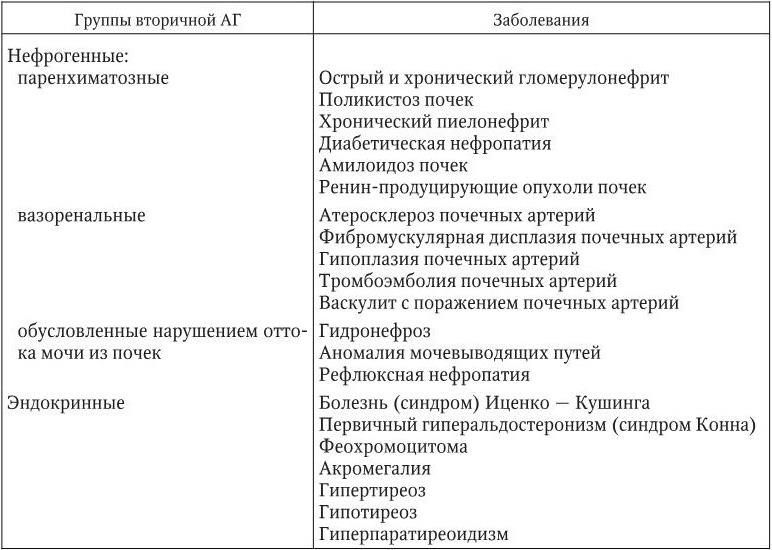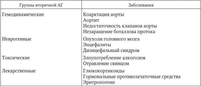 Дифференциальный диагноз. Существует много заболеваний, клиническая симптоматика которых включает АГ. К признакам общего характера, позволяющим заподозрить симптоматическую АГ, относится раннее (в возрасте до 20 лет) или, напротив, позднее (у лиц старше 65 лет) начало заболевания, быстрое достижение АГ III степени (> 180/100 мм рт. ст.), тяжелое поражение органов-мишеней, рефрактерность к антигипертензивной терапии. Основные группы заболеваний, сопровождающихся повышением АД, указаны в табл. 1.8.