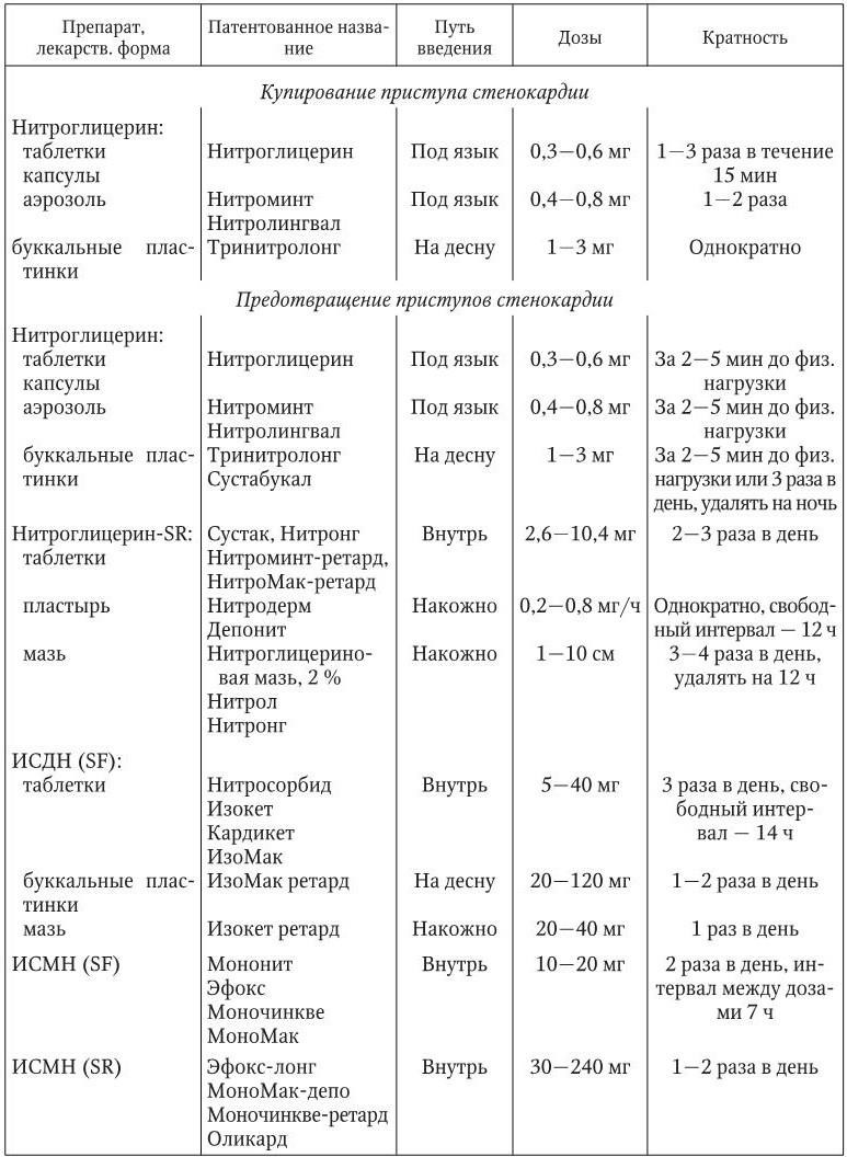 Средние дозы, путь ведения и кратность приема органических нитратов, наиболее часто применяемых для лечения больных стенокардией