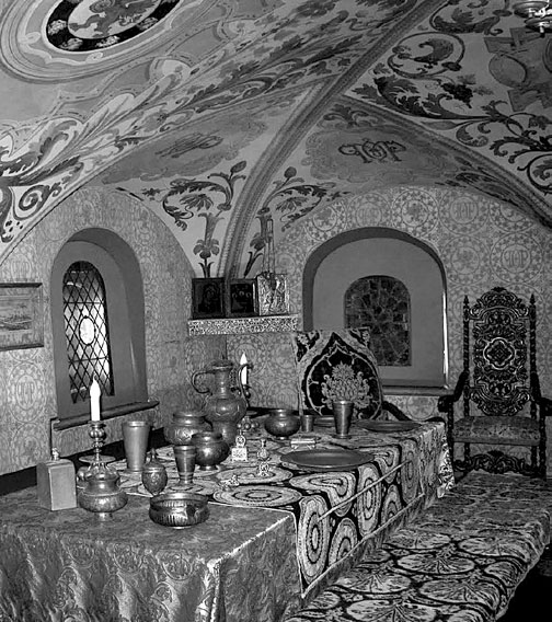 Рядом с двором Никиты Романовича располагались дворы других бояр. Все они строились по типовому плану. В правом нижнем углу находился большой каменный дом – так называемые «палаты на верхних погребах». Палаты Никиты Романовича двумя этажами выходили на улицу Варварку. Небольшая их часть сохранилась до наших дней. В глубине двора, недалеко от западной стены, обращенной к Кремлю, стоит еще одно здание, которое называлось палатами «на нижних погребах». Как указано в документах, были здания и более древние. В центре усадьбы видно отдельно стоящее высокое сооружение типа башни. Возможно, это повалуша – общая летняя, холодная спальня, куда могла на ночь уйти вся семья.