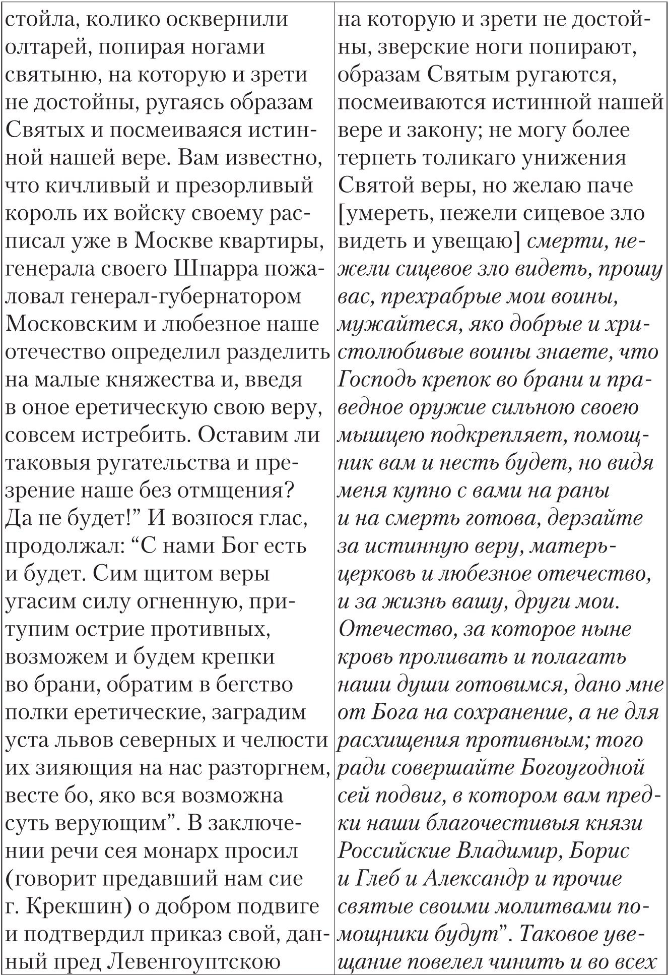Следовательно, мы попадаем в какой-то замкнутый круг, прямо скажем, вольных интерпретаций текста, изначально восходящего к сочинению Феофана Прокоповича, который сам речь Петра воспроизводил, согласно его собственному признанию, весьма приблизительно. После всего вышесказанного уместно вообще поставить вопрос, была ли такая речь Петром в действительности когда-либо произнесена. П. К. Гудим-Левкович полагал, что «Приказ…» был сочинен Феофаном, и вообще приказы в начале XVIII в. перед войсками не отдавались, типографий при штабах не было, солдаты считались механической силой, главнокомандующие к ним не обращались. Фридрих Великий свои наставления давал только генералам. Впервые приказы, оглашаемые перед войсками, ввел Бонапарт в 1796 г. С этой крайней точкой зрения можно бы согласиться, но нельзя отвергать предположение, что Петр все-таки произносил какие-то слова перед собранными на совет генералами и старшими офицерами, которым приказал, согласно П. Н. Крекшину, «чтоб они увещевали обер-офицеров, и урядников, и рядовых к доброму отпору против неприятеля»93. Так что полностью отбрасывать возможность существования речи-приказа перед битвой не следует, хотя можно спорить о ее содержании, месте произнесения и об адресатах этого обращения.