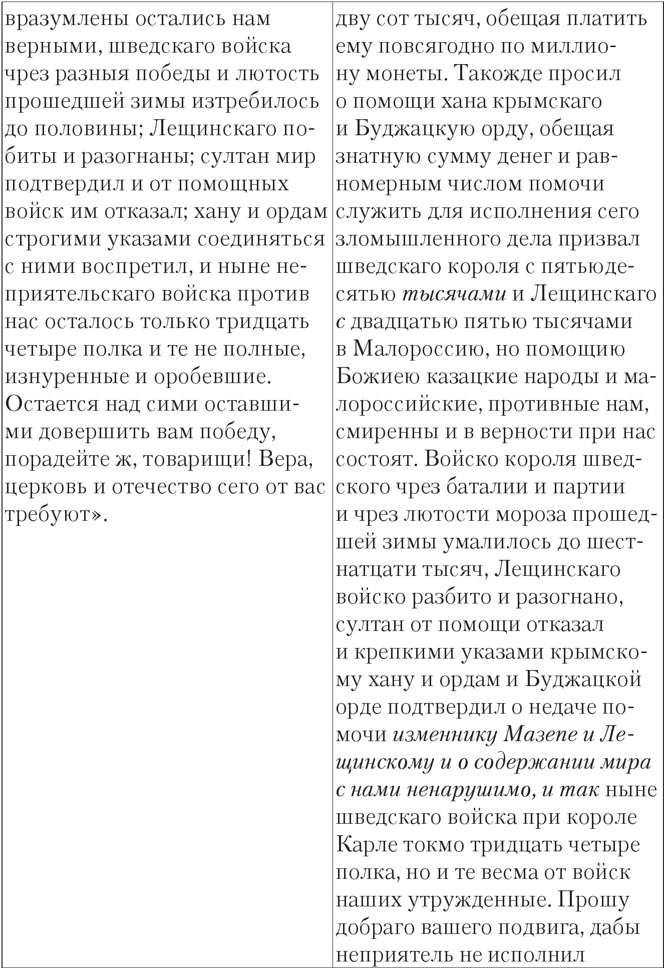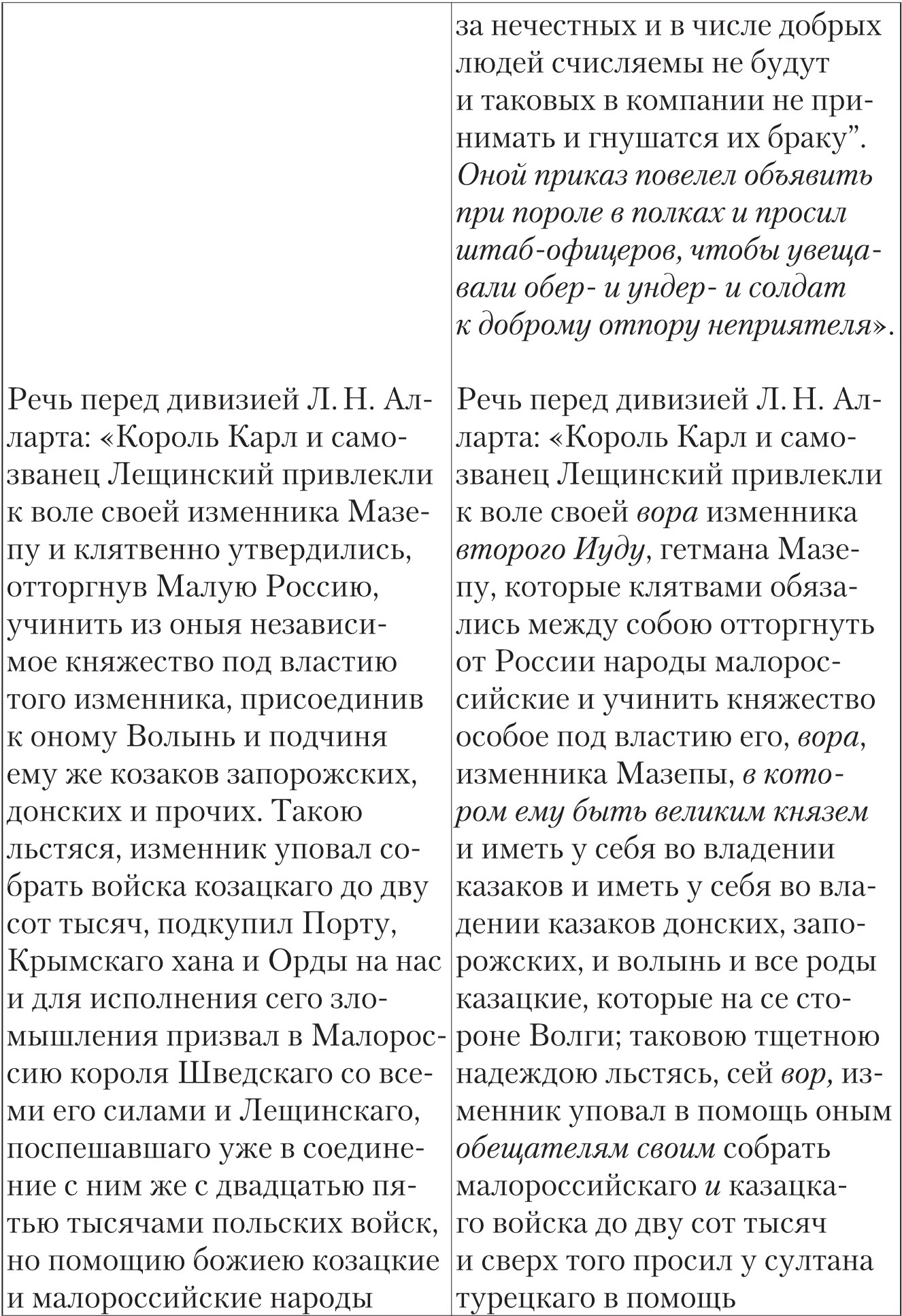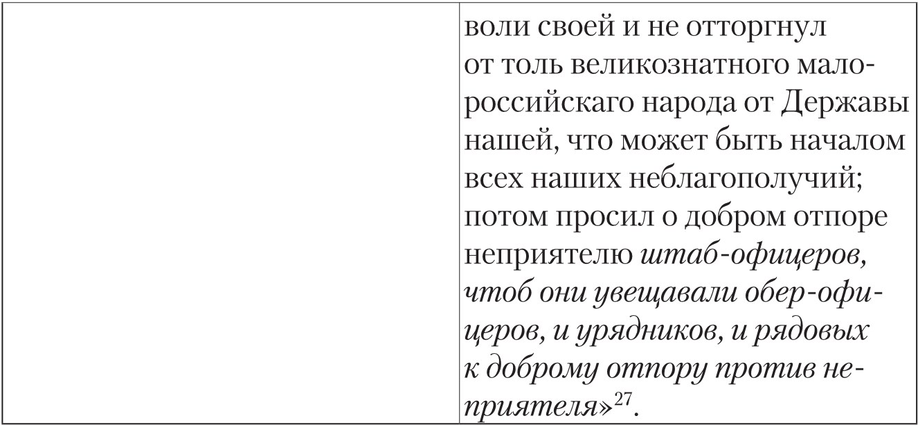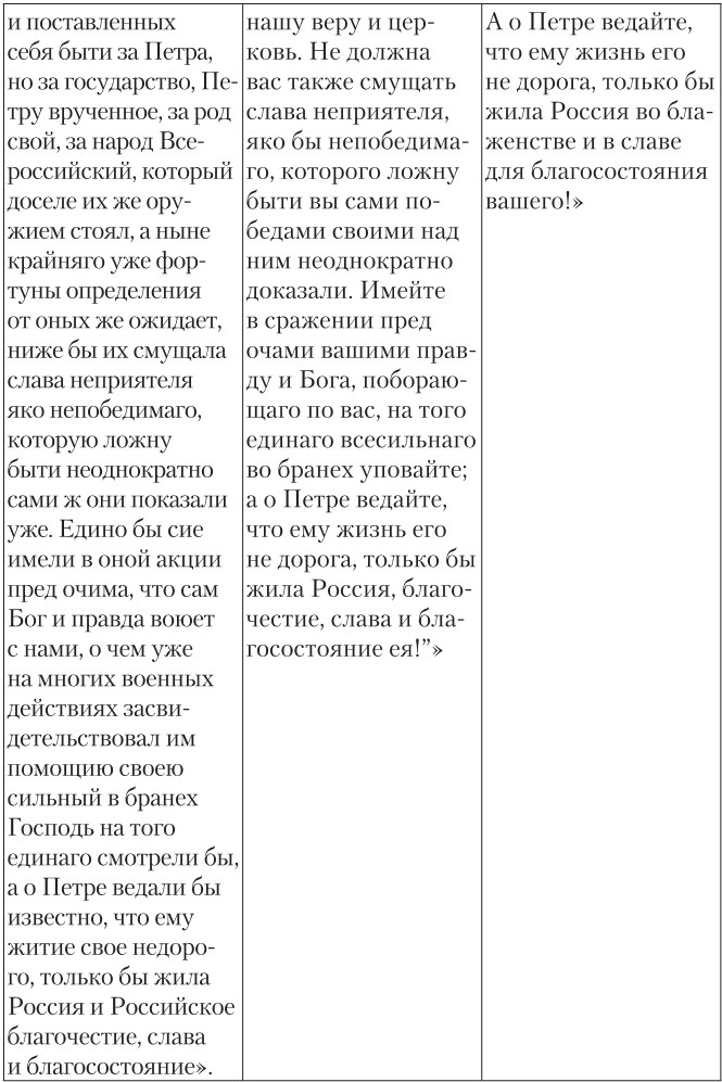 После процитированного в таблице отрывка И. И. Голиков писал: «Таковыми и сим подобными словами (говорит архиепископ Феофан), когда возбуждал воинов своих Государь, сии бодрый на себе вид являя веселым лицем, многие же и голосом готовых и охотных себя быти показывали, и многий вопль был повсюду где не появлялся Государь, просящий онаго и увещавающий, дабы щадил в себе надежды Российския, и если ему смерть его не страшна, то ведал бы, что она страшна есть всему воинству его и всему отечеству». При этом Голиков обещает читателю посвятить событиям на Полтавском поле отдельный том, что и делает в изданном в 1790 г. «Дополнении к Деяниям…», а затем включает «речь» в скорректированном Феофановом варианте в новое (подготовленное, но опубликованное уже в 1801 г., после смерти автора) второе издание «Деяний…»83. Д. П. Бутурлин, как видно из таблицы, еще больше, чем И. И. Голиков, «усовершенствовал», осовременил текст Голикова и дал по-военному строгий заголовок: «Приказ, отданный Его величеством Петром 1-м воинству своему в день Полтавскаго сражения июня 27 дня 1709 года»84.