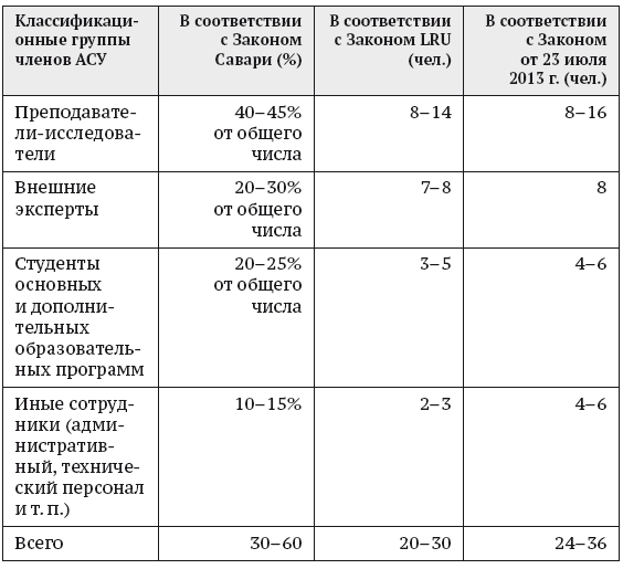 Закон преобразовал внутреннюю систему управления университета, прекратив существование двух центральных университетских советов – Ученого совета (Conseil Scientifique) и Совета по образованию и студенческой жизни (Conseil des études et de la vie étudiante), преобразовав их в Комиссию по науке [2] (Commission de la recherche) и Комиссию по учебной работе и студенческой жизни [2] (Commission de formation et de la vie universitaire) соответственно. Обе комиссии образуют Академический совет университета (Le Conseil Académique) и имеют консультативные функции. В случае если решения, принимаемые Комиссией по науке и Комиссией по учебной работе и студенческой жизни, затрагивают финансовые аспекты, то в обязательном порядке необходимо получить одобрение Административного совета университета (Conseil d’administration) (табл. 1).