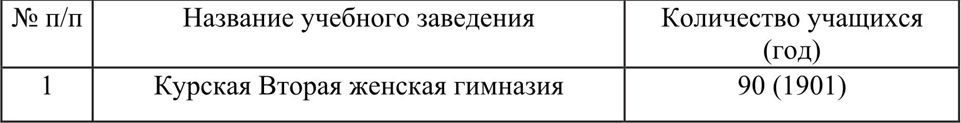 Таблица 1. Число женских учебных заведений и учащихся в них в Курской губернии в начале XX в. Таблица содержит сведения о гимназиях и количестве учащихся в них, в том числе учебные заведения на территории нынешней Белгородской области (тогда входила в состав Курской губернии).