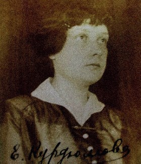Курдюмова (урожденная Четверикова) Елена Михайловна родилась 25 июня 1890 г. в г. Обояни в семье священника Михаила Четверикова. В 1907 г. окончила полный курс учения в объеме 7 классов Рыльской женской гимназии. В 1908 г. окончила дополнительный 8-й класс Рыльской женской гимназии, получив при этом звание домашней наставницы. 6 ноября 1908 г. была назначена учительницей земской начальной школы в слоб. Пушкарной Обоянского уезда Курской губернии, где состояла до 31 декабря 1909 г. 8 января 1910 г. вступила в брак с Василием Филипповичем Курдюмовым, назначенным на место диакона Покровской церкви г. Рыльска, и уехала с мужем. 5 мая 1911 г. она пишет прошение Директору МВЖК о зачислении в число слушательниц курсов, но сталкивается с, казалось бы, непреодолимым препятствием: ее муж, давший согласие в ноябре 1910 г., наотрез отказался продлевать его в 1911 г. Ее отец пишет прошение на имя Директора курсов с просьбой разрешить дочери посещение занятий физико-математического отделения курсов и, о, победа!, оно было получено. Елена Михайловна смогла-таки отправиться в Москву! Училась довольно успешно и в числе немногих известных нам курсисток-курянок смогла дойти до получения диплома. Однако путь к успеху был тернист: катастрофически не хватало средств на оплату обучения. В личном деле Е.М. Курдюмовой имеется прошение от 14 октября 1914 г. об отсрочке оплаты до декабря. И вот заветная цель достигнута – диплом получен: «В удостоверение сего, постановлением Физико-Математического факультета, 1915 года, февраля 3 дня, ей выдан диплом первой степени» [17, л. 72]. Она становится преподавательницей Валуйской Мариинской женской гимназии Воронежской губернии: «Окончившая Московские Высшие женские курсы Елена Курдюмова, урожденная Четверикова, допущена к преподаванию во вверенной мне Валуйской Мариинсой женской гимназии…марта 28 дня 1916 г., № 69» [Там же, л. 71].