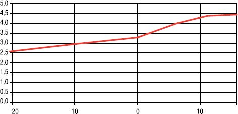 От инверторных VRF-систем на фреоне R410A, в силу их заведомого технического превосходства над обычными сплит-системами, следует ожидать более высокого коэффициента трансформации – не менее 2,5 при температуре наружного воздуха −20 °C (среднесезонный COP – более 3). Поэтому использование для теплоснабжения в условиях холодного климата данного типа оборудования более предпочтительно. График зависимости COP от температуры, характерный для VRF-систем, представлен на рис. 4.