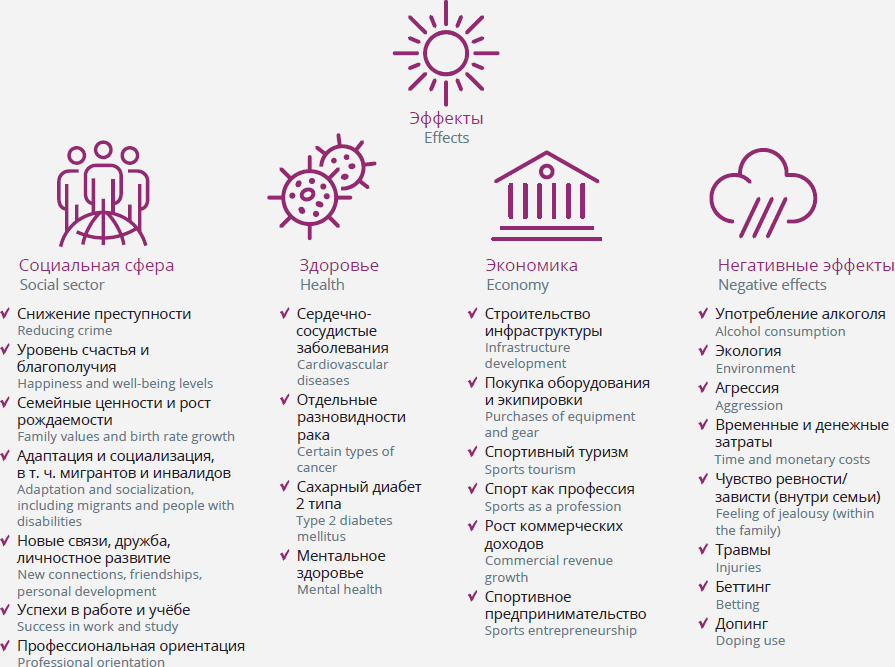 In terms of economic effects, it is also necessary to consider the athletes’ costs to purchase the equipment, pay for attending the sports sections, travel to competitions (payment for tickets, food, accommodation). In addition, a significant effect can be achieved by the growth of commercial indicators (sponsorship revenues) for those projects that attract a significant audience.