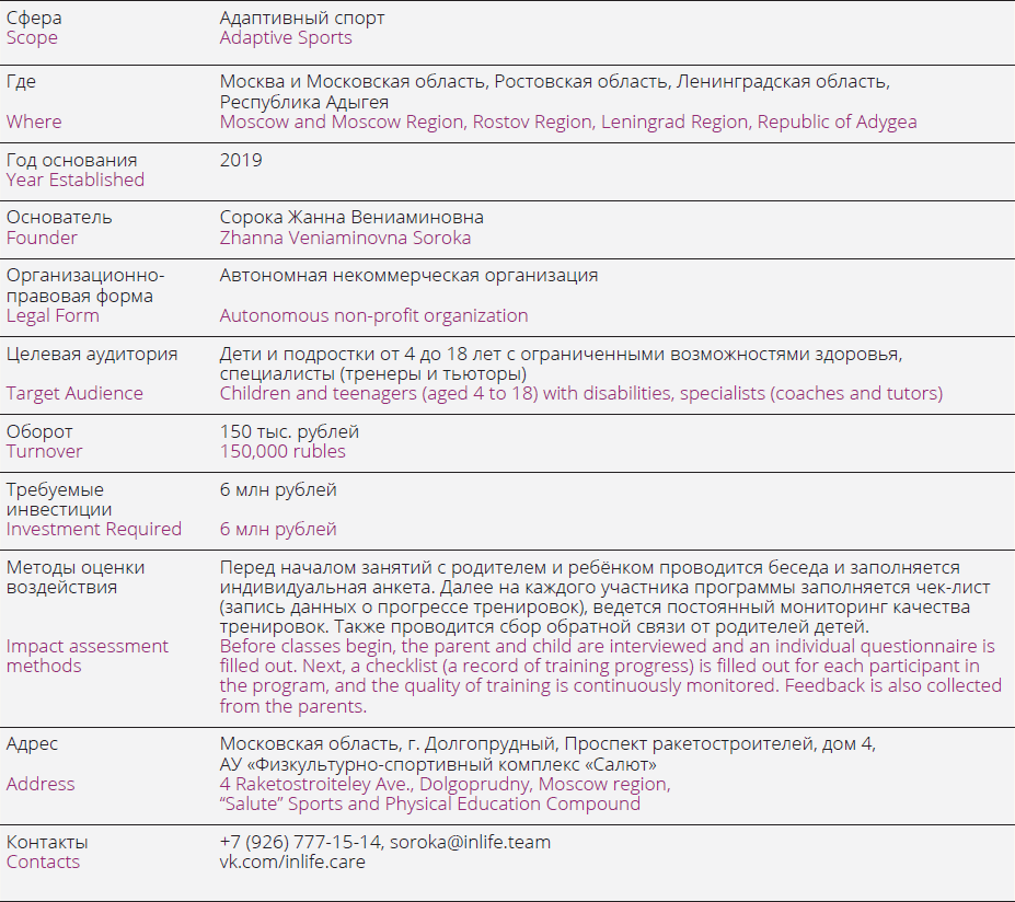 Grantee of the Vladimir Potanin Foundation in 2023. The “Figure Skating for All” professional development program (extended adaptive figure skating practices in Moscow and the Moscow region) was one of the laureates of the “Sports Platoon” competition, part of the “Power of Sports” charity program.