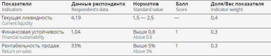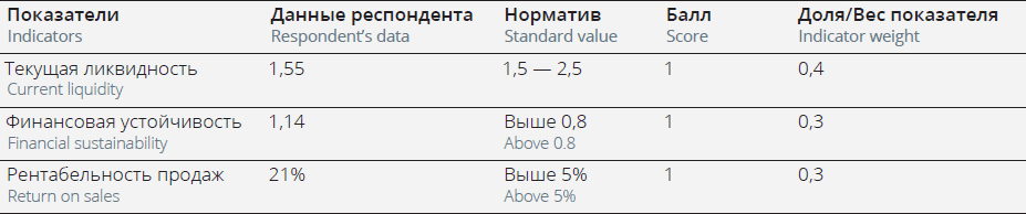 The weight ratios between the three indicators are close, but the current liquidity is given a somewhat larger weight. The standard level of the current liquidity ratio means the organization has a reliable financial position in the current year, and therefore can improve the other two indicators for the year. If, however, the organization cannot cover its liabilities in the current year, the prospect of long-term reliability and efficient distribution of current revenues and expenditures does not warrant complete protection against the bankruptcy risks.