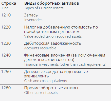 Table 1. Types of current assets in the balance sheet form