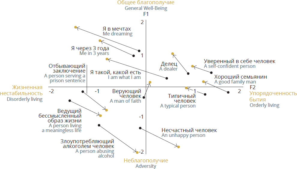 Рисунок 1. Пример семантического пространства динамики ролевых позиций в ходе гипнотерапии у пациентов наркологической клиники по факторам «Общее благополучие» ↔ «Неблагополучие» и «Упорядоченность бытия» ↔ «Жизненная нестабильность (готовность к переменам)»