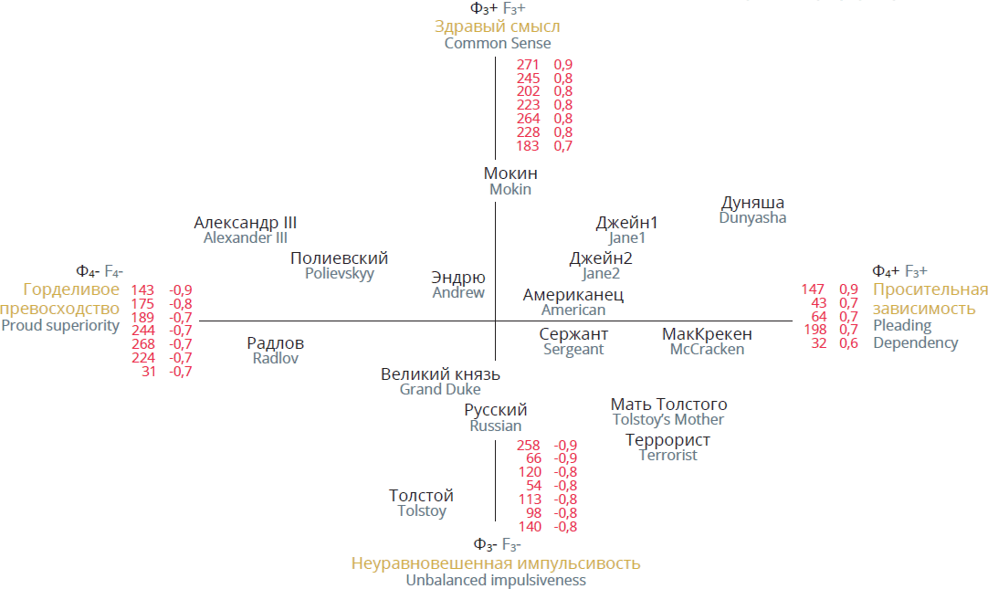 На основании полученных факторов были построены семантические пространства персонажей (пример на Рисунке 2).