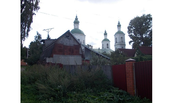 2. Место расположения русского «Гуляй-города» в битве при Молодях, 11—15 августа 1572 года. Фото автора. За жилыми постройками виден Воскресенский храм (1703 года основания), при котором, увы, нет стел, плит, других знаков состоявшегося здесь великого события. По свидетельству старожилов, курганы захоронений героев сражения просматривались до 50-х годов прошлого века: после чего были распаханы под посевы свеклы, либо застроены.