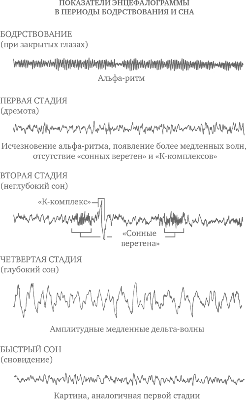 Дремота представляет собой переходное состояние между бодрствованием и более глубокими стадиями медленного сна, однако наступление следующих стадий можно однозначно зафиксировать лишь при записи электрической активности нейронов головного мозга, или «мозговых волн». В начальный момент второй стадии на электроэнцефалограмме появляются короткие пики очень быстрых импульсов (так называемые «сонные веретена») и более медленные высокоамплитудные волны, или «К-комплексы» (см. рисунок приведенный далее). На этой стадии человека еще легко разбудить, и он может вообще не понять, что спал, – это зависит от того, сколько он находился во второй стадии сна, насколько глубоким был его сон на момент пробуждения и, конечно, от индивидуальных особенностей. Как и при пробуждении на первой стадии, на второй люди почти никогда не видят фантастических сновидений, но иногда упоминают о мыслеобразах или грезах наяву.