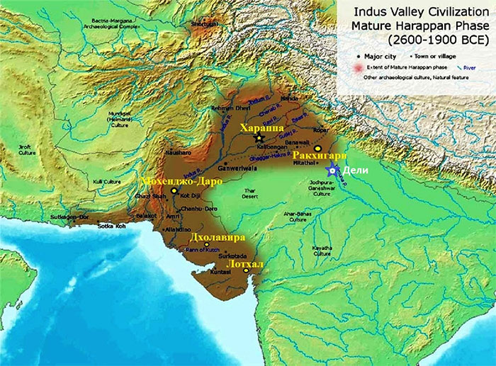 Долины рек Инда и Ганга богаты осадочными горными – лёссовыми (нем. Löß или Löss – рыхлый, осыпающийся) – почвами, очень благоприятными для ведения сельского хозяйства. Еще в глубочайшей древности эти земли стали очагами оседлой жизни – здесь существовала древнейшая Индская (протоиндийкая) цивилизация. Она была открыта в 1921 г., а к концу XX столетия стали известны уже более 100 индских поселений. Среди городов наиболее значительными были Мохенджо-Даро и Хараппа, благодаря чему индскую цивилизацию называют еще Хараппской, а также Калибанган (по названию поселения неподалеку от Хараппы) (ил. 1).