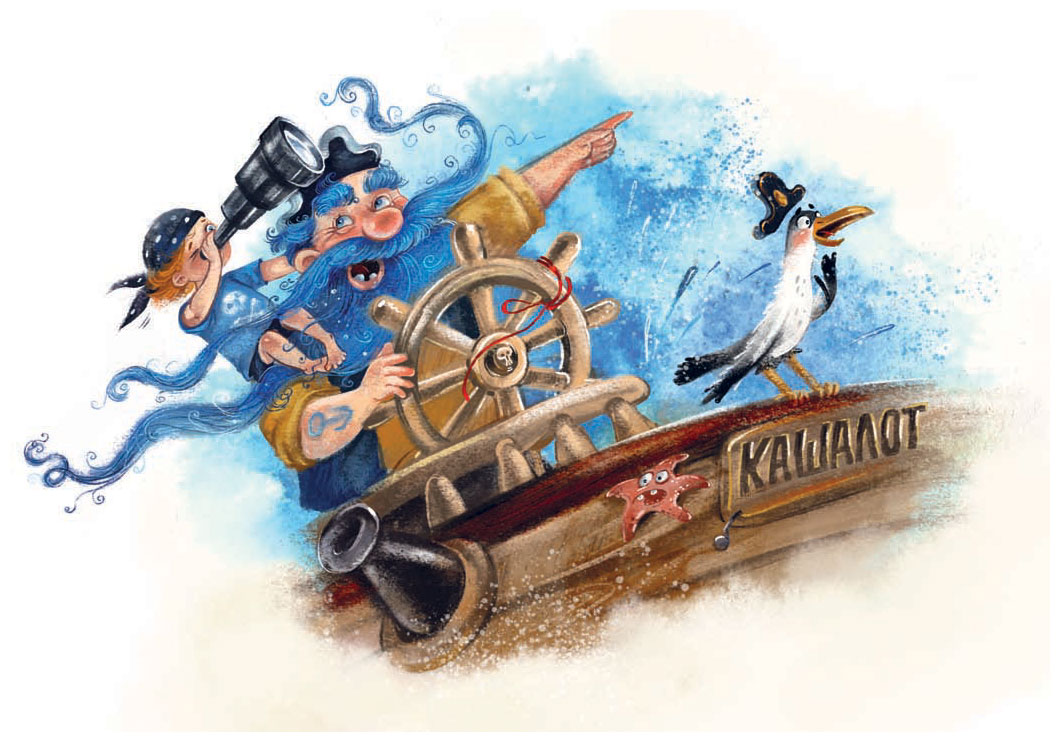 Шторм бушевал всю ночь. Димка грелся под папиной бородой, а когда тучи рассеялись и взошло солнце, пираты разлеглись на золотом пляже. У самого берега на камнях торчало всё, что осталось от «Кашалота». Пиратский корабль превратился просто в кашу. На остатках борта так и было написано: «Каша», потому что буквы «лот» отвалились.