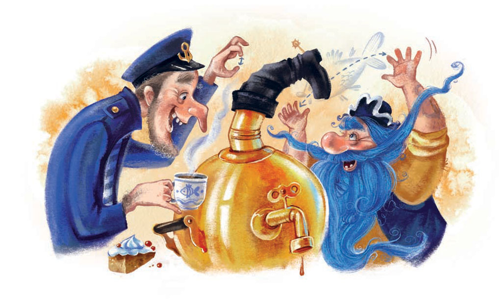 – Всем покинуть корабль! – прокричал Синяя Борода, вместе с остальными пролетая над скалами. Одной рукой он крепко держал Димку, другой – Пончика, а ногой подцепил чугунную гирю, про которую думал, что она золотая.