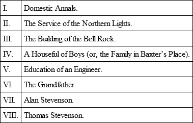 Saturday, 17th.Since I wrote this last, I have written a whole chapter of my grandfather, and read it to-night; it was on the whole much appreciated, and I kind of hope it ain’t bad myself. ’Tis a third writing, but it wants a fourth. By next mail, I believe I might send you 3 chapters. That is to say Family Annals, The Service of the Northern Lights, and The Building of the Bell Rock. Possibly even 4 —A Houseful of Boys. I could finish my grandfather very easy now; my father and Uncle Alan stop the way. I propose to call the book: Northern Lights: Memoirs of a Family of Engineers. I tell you, it is going to be a good book. My idea in sending Ms. would be to get it set up; two proofs to me, one to Professor Swan, Ardchapel, Helensburgh – mark it private and confidential – one to yourself; and come on with criticisms! But I’ll have to see. The total plan of the book is this —